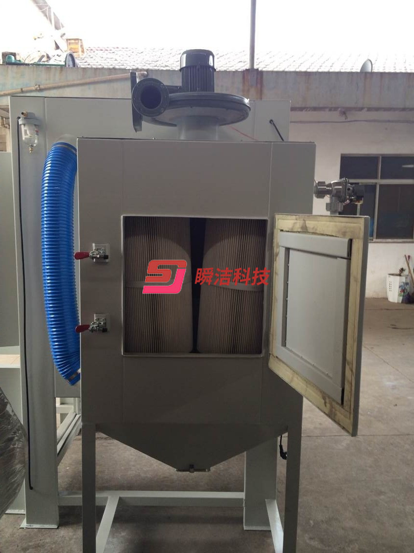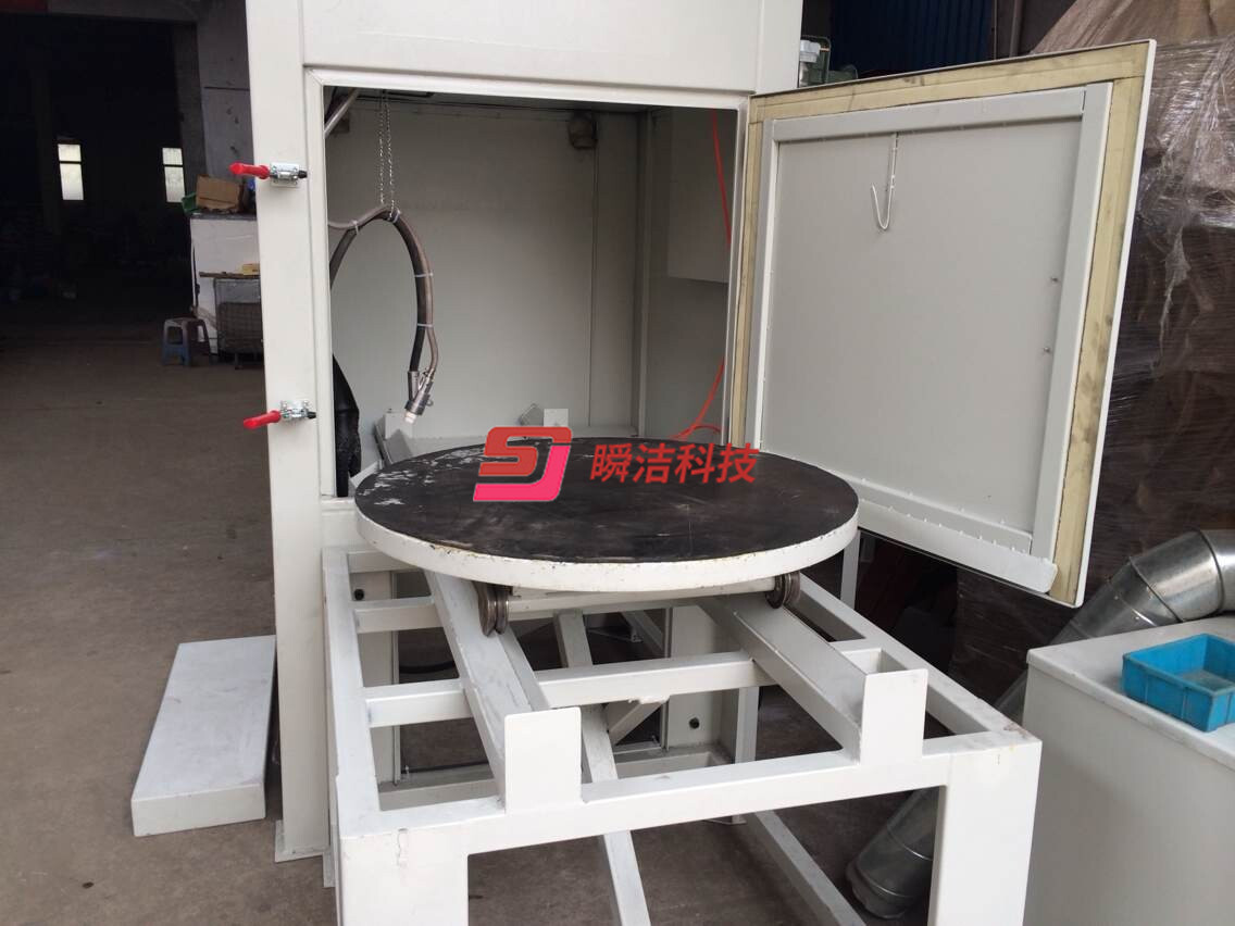 、配備活動臺車,和轉盤,操作時將工件放在轉盤上,然后推入機內即可噴砂作業,操作簡單省力。